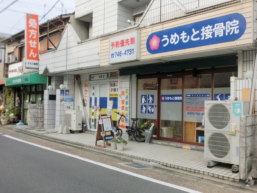 右へ曲がって真っすぐ進むと、すぐに右手に郵便局があります。また少し進むと左手にケーキ屋さんがあります。 そのケーキ屋さんの3軒となりが「うめもと接骨院」です。